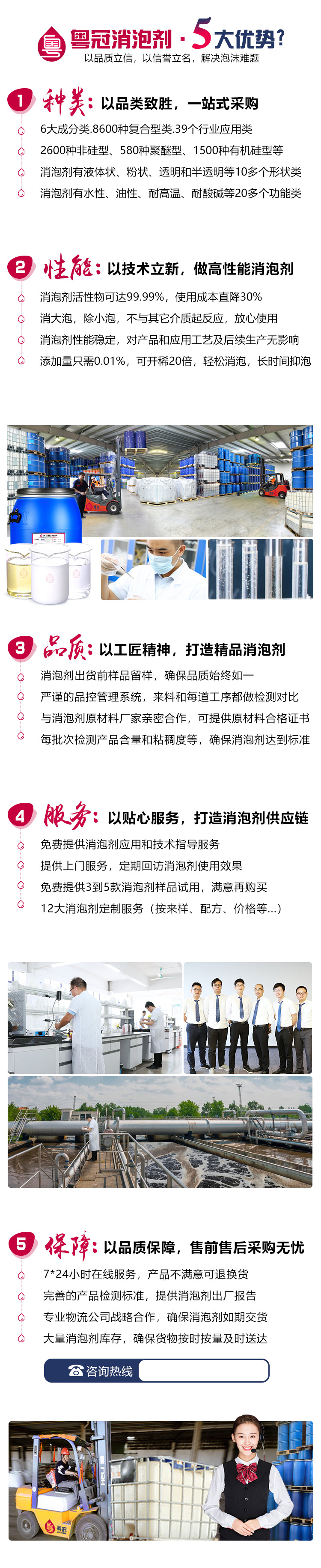 粵冠消泡劑產品廣泛應用于水處理、切削液、工業清洗、印染、造紙、涂料、粘合劑,生物發酵、電廠脫硫、石油開采等38個行業領域,有消泡解決方案3000多種類型。產品有有機硅類,聚醚類,礦物油類,高碳醇類,脂肪酸類,有單體,有復合體,有透明的,有淡黃的,有乳白的各種類型消泡劑,實現一站式采購。